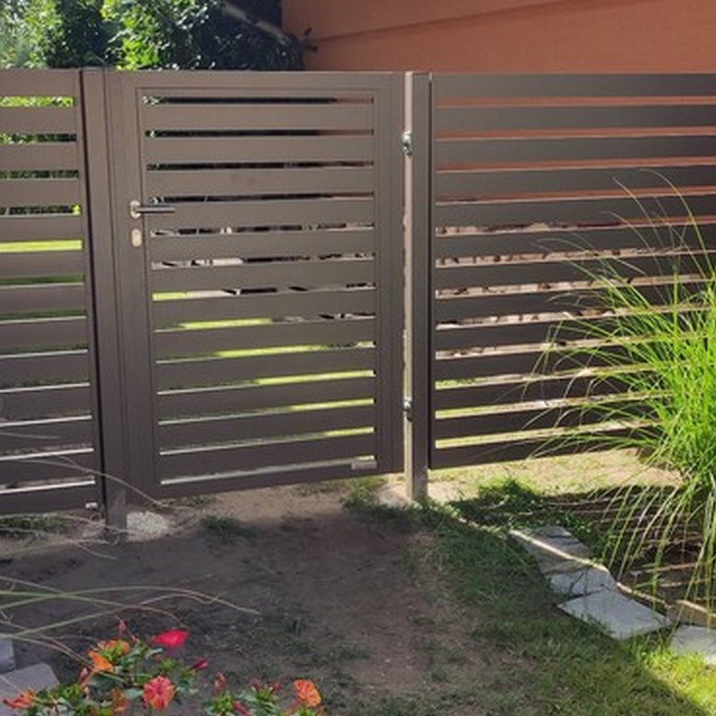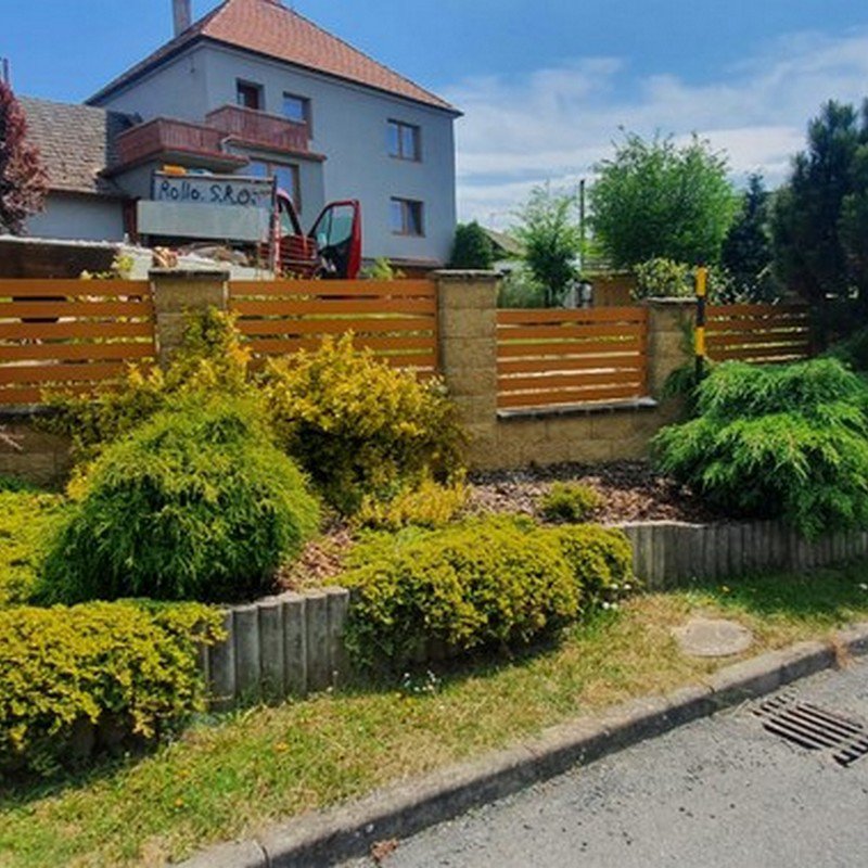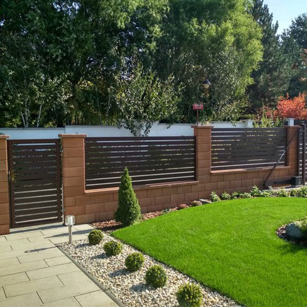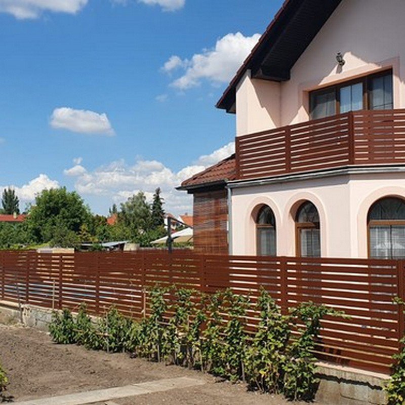 Okenicové hliníkové ploty mají lamely připomínající nedovřené žaluzie. Plot působí vzdušně a přitom poskytuje soukromí.